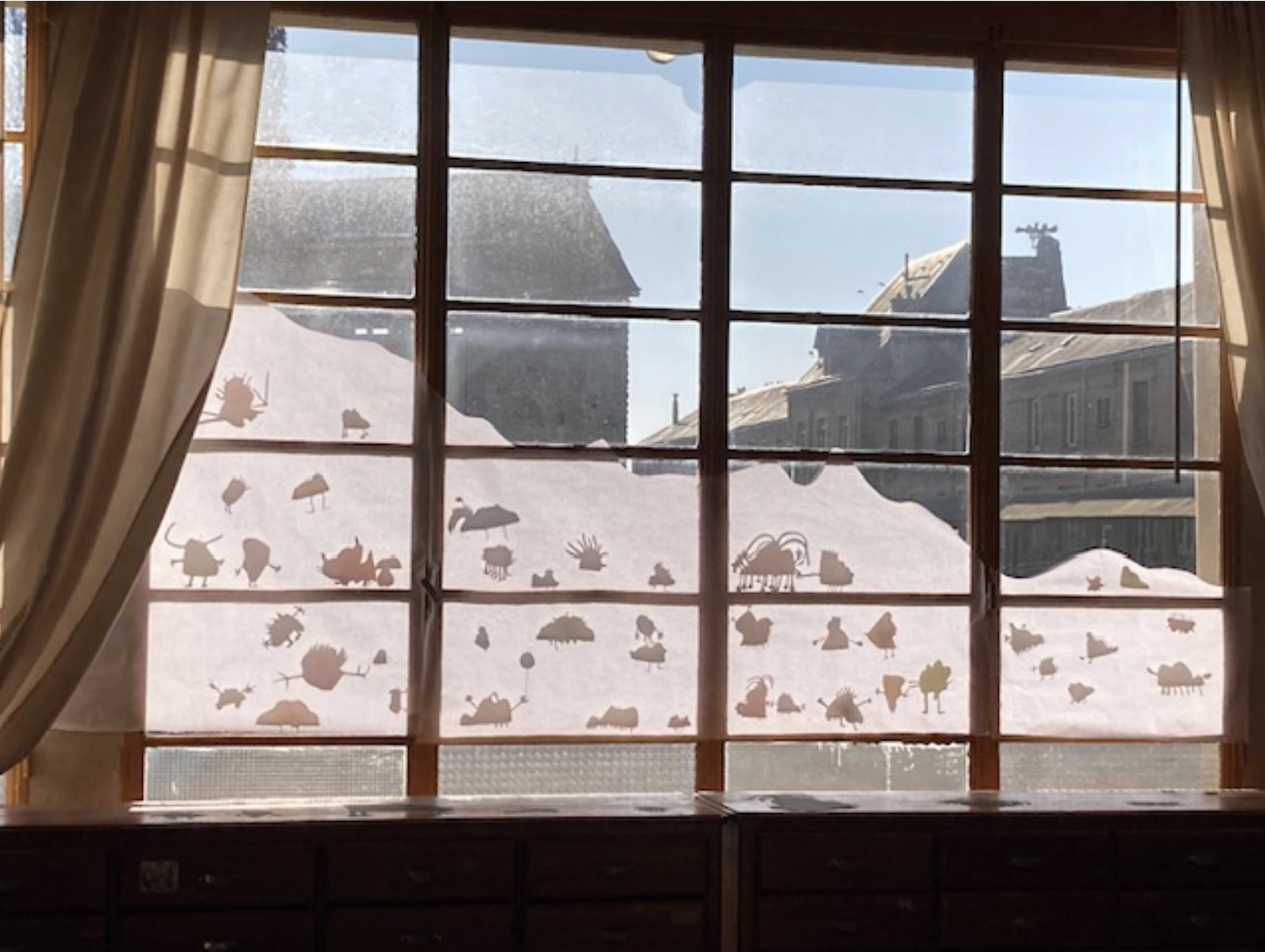 Au fil de la semaine, une installation vivante et évolutive se construit : les ombres des créatures apparaissent progressivement, projetées par un rétroprojecteur et la lumière naturelle, transformant l’espace en paysage imaginaire partagé.